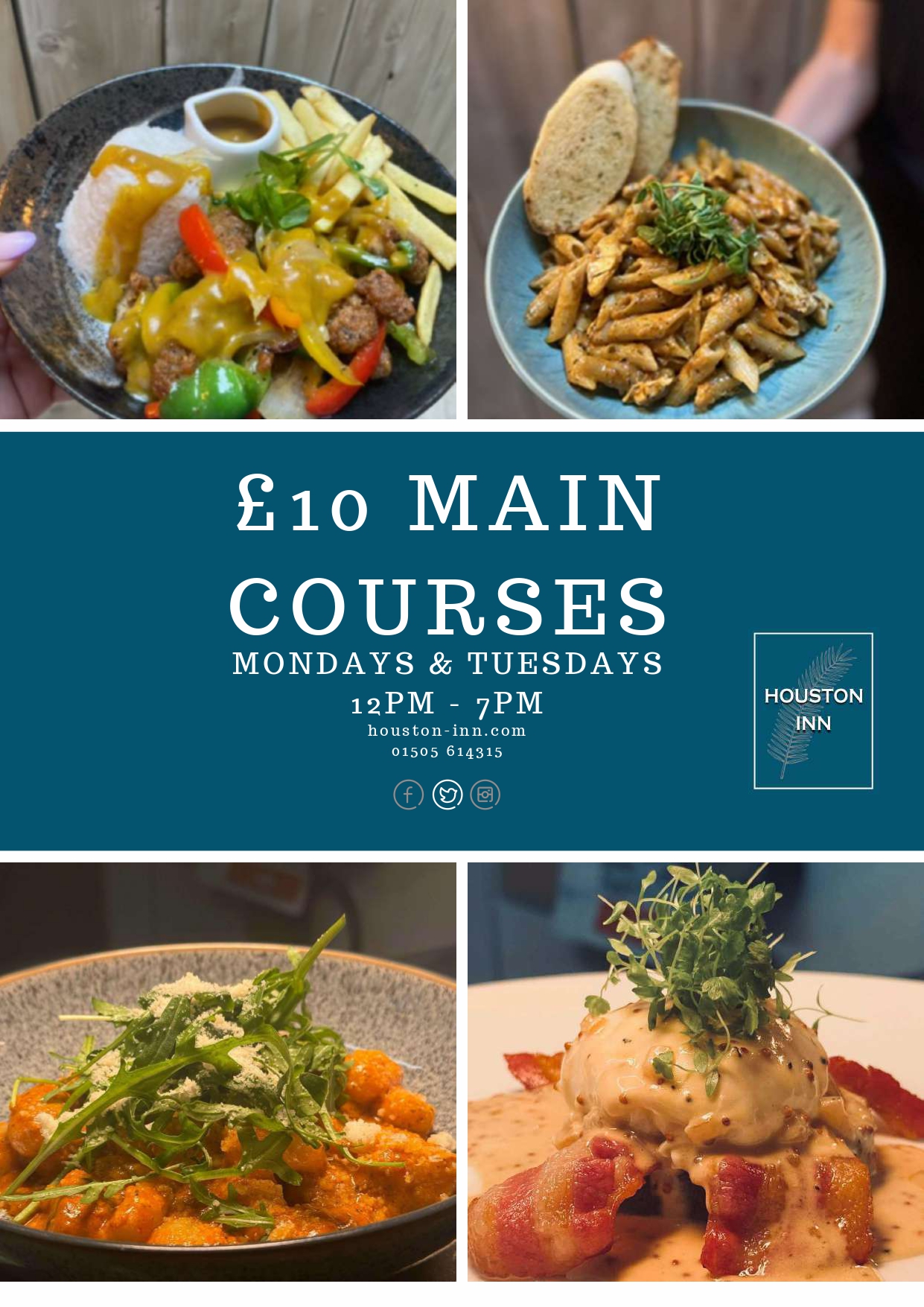 Enjoy classic pub favourites at the Houston Inn, with main courses for just £10 on selected days.